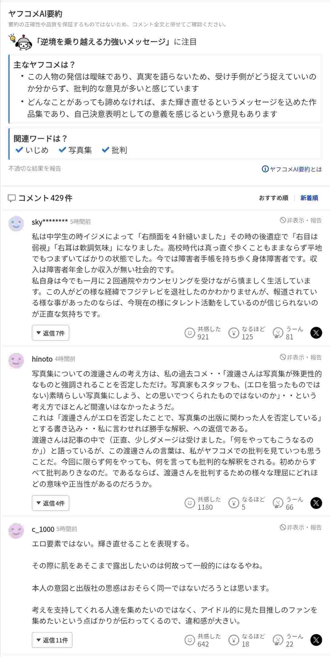 渡邊渚「写真集はエ口売りではなく、もっと違うメッセージがある」 ヤフコメ民「私は障がい者で被イジメ経験者ですが、理解できません」