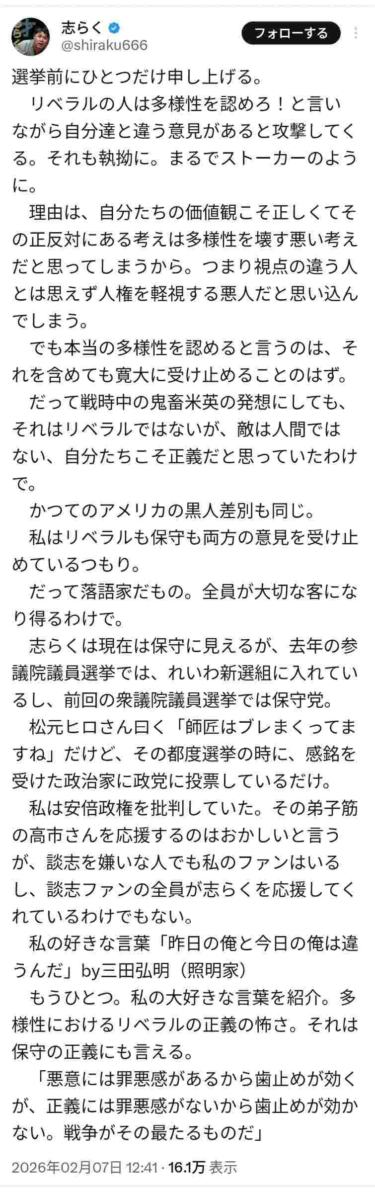 立川志らく「私はリベラルも保守も両方の意見を受け止めている。去年の参議院ではれいわに入れたし、前回の衆議院では保守党に入れた」
