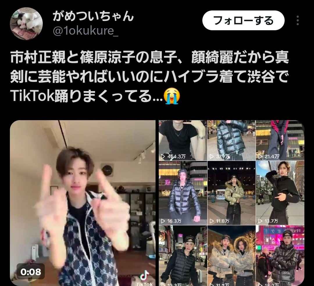 市村正親と篠原涼子の息子、顔綺麗だから真剣に芸能やればいいのにハイブラ着て渋谷でTikTok踊りまくってる…😭