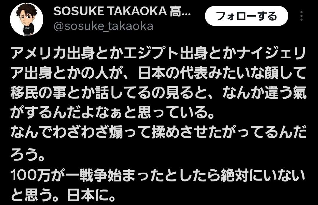 アメリカ出身とかエジプト出身とかナイジェリア出身とかの人が、日本の代表みたいな顔して移民の事とか話してるの見ると、なんか違う氣がするんだよなぁと思っている。