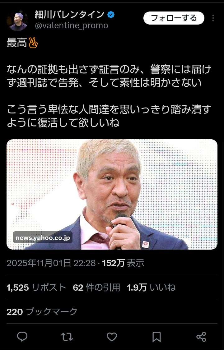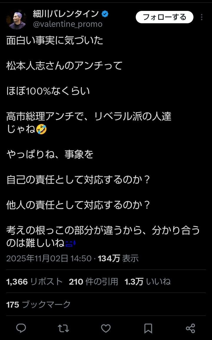 細川バレンタイン「松本人志さんのアンチはほぼ100%高市総理アンチで、リベラル派の人達」