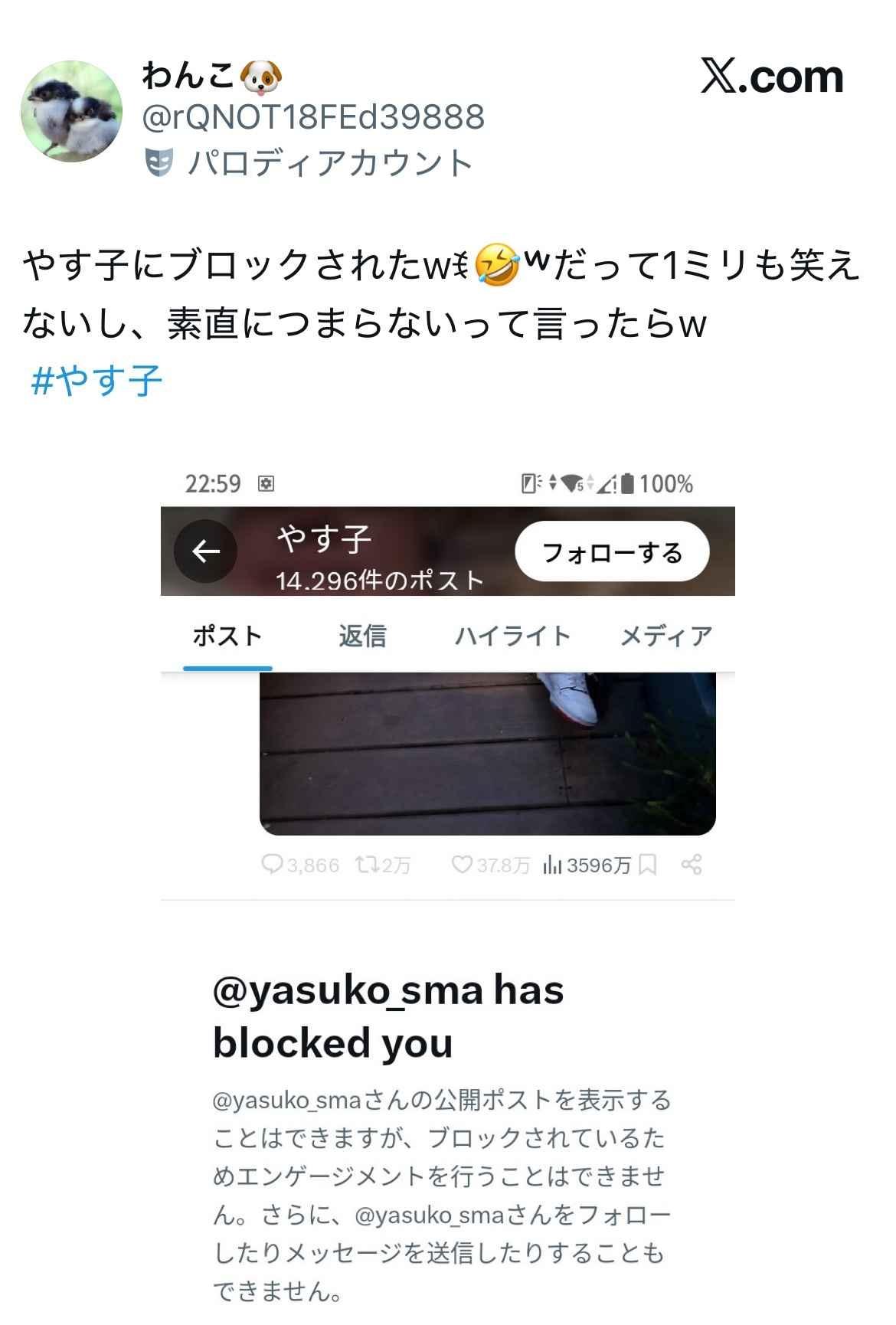 つまらないって言ったらブロックされたーってやり始めた時点でこれに関してはやす子の対応が正しかった証明やな