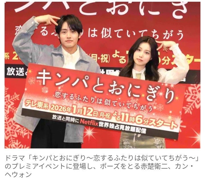 俳優の赤楚衛二が16日、都内で主演を務めるテレビ東京系連続ドラマ「キンパとおにぎり~恋するふたりは似ていてちがう~」(来年1月12日スタート、月曜・後11時6分)のプレミアイベントにヒロインのカン・ヘウォンと登場した。