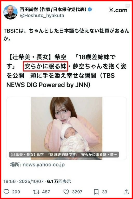 このニュース記事に対し、百田尚樹氏は「TBSには、ちゃんとした日本語も使えない社員がおるんか」とコメント。