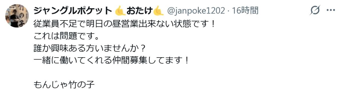 飲食店経営芸人が”危機”訴え「従業員不足で明日の昼営業出来ない状態です!これは問題です」