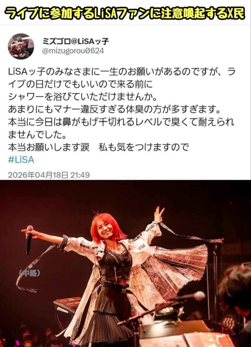 【話題】鬼滅の刃の主題歌『紅蓮華』などでお馴染みの歌手・LiSAさんのライブに参加するオタク達の“体臭”が問題に「お願いだからライブの日だけでもシャワーを浴びてくれ」「鼻がもげて千切れるレベルで臭かった」と悲痛な叫びが話題に