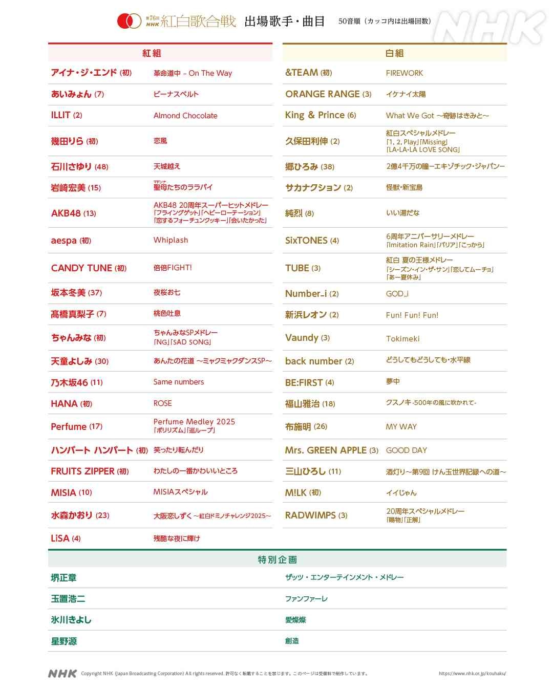◆「第76回NHK紅白歌合戦」曲目発表(カッコ内は出場回数)