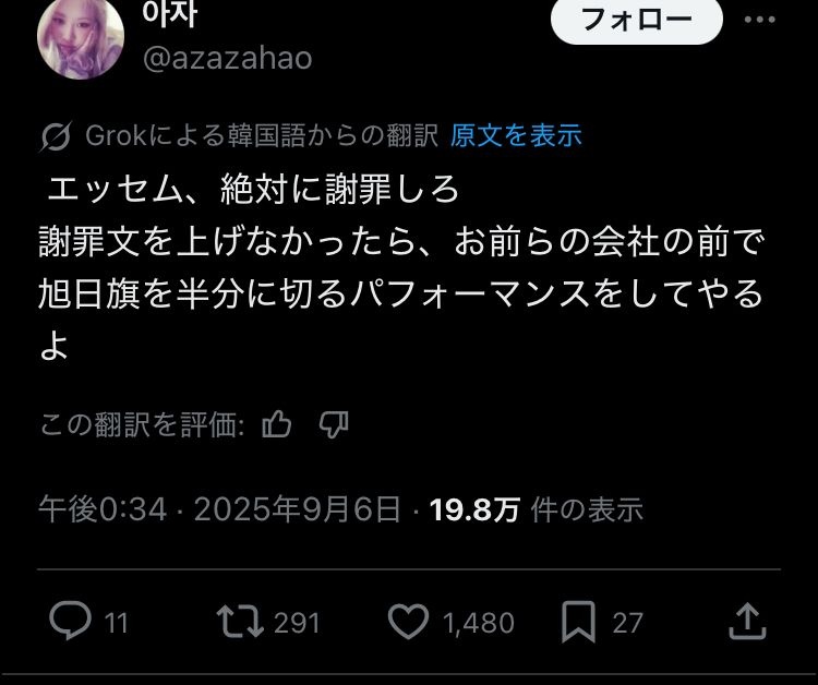 https://video.twimg.com/amplify_video/1963863013435531264/vid/avc1/1280×720/XDGmCq05IeCfvOdu.mp4韓国人「絶対に許さない、会社の前で旭日旗を真っ二つにしてやる。」