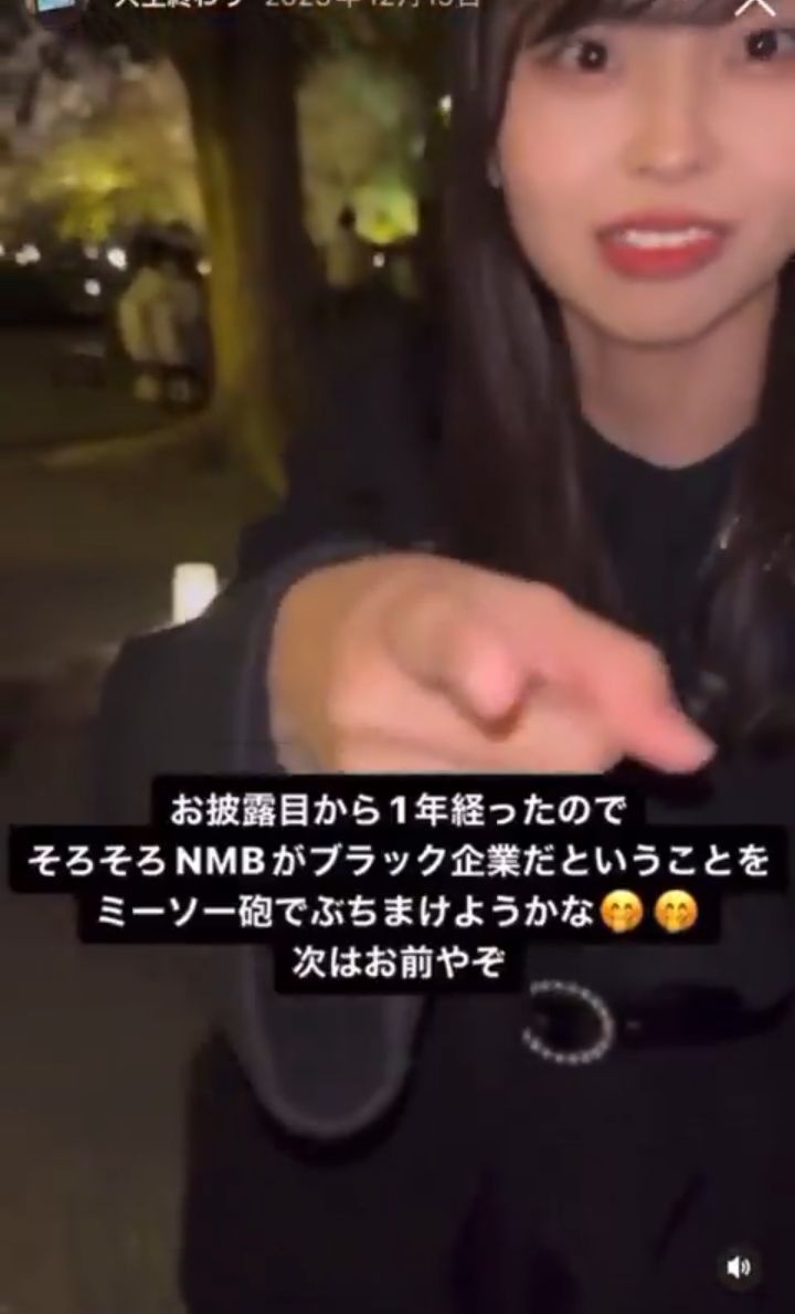 >また、この間、画面には「お披露目から1年たったので そろそろNMBがブラック企業であるということを ミーソー砲でぶちあげようかな 次はお前やぞ」というテロップが表示されている。