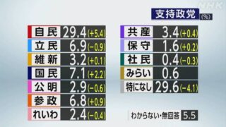 ニュー速 政党支持率 自民29.4% 国民7.1% 立民6.9% NHK www