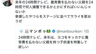 嫌儲 女さん「来年の24時間テレビ、養育費払わない父親を何人捕獲できるかとかにすればいい」4万いいね