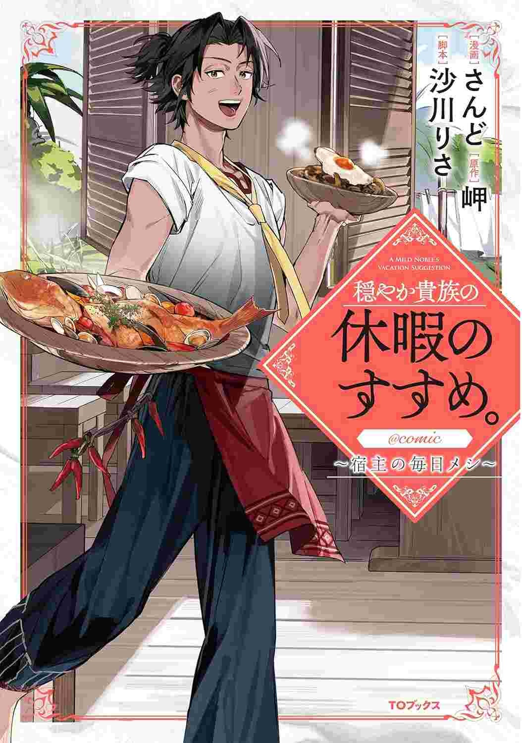 TVアニメが放送中の「穏やか貴族の休暇のすすめ。」。そのスピンオフ作品である「穏やか貴族の休暇のすすめ。@COMIC ~宿主の毎日メシ~」では、リゼルたちの泊まりつけの宿の主人・宿主の日常を見ることができる。滞在中の客をもてなすため、仕入れに洗濯と夜明け前から仕事に励む宿主の姿や、そんな彼のもとを訪れる珍客とのやり取りを描く。