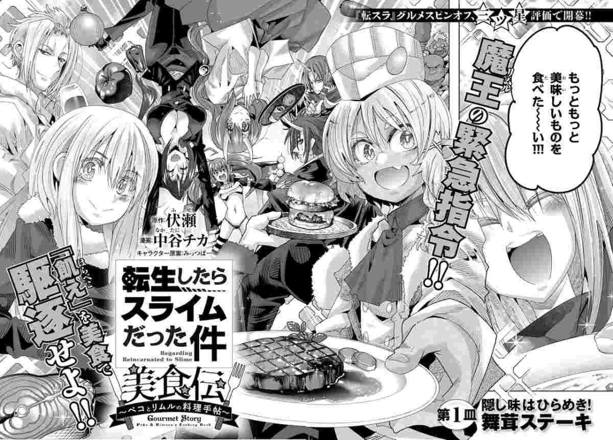 「転生したらスライムだった件 美食伝 ~ペコとリムルの料理手帖~」は、魔王リムルに「ペコ」と名付けられたゴブリンを描くグルメマンガ。ペコがリムルから名前とともに与えられた使命、それは「皆をお腹いっぱいにして幸せにする」ことだった。リムルの館の厨房で配膳係として働くペコが、料理に特化したユニークスキルを武器に料理人へと成長していく姿が描かれる。マンガは中谷チカが担当している