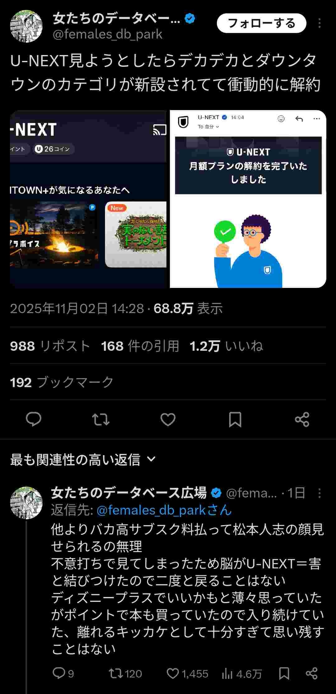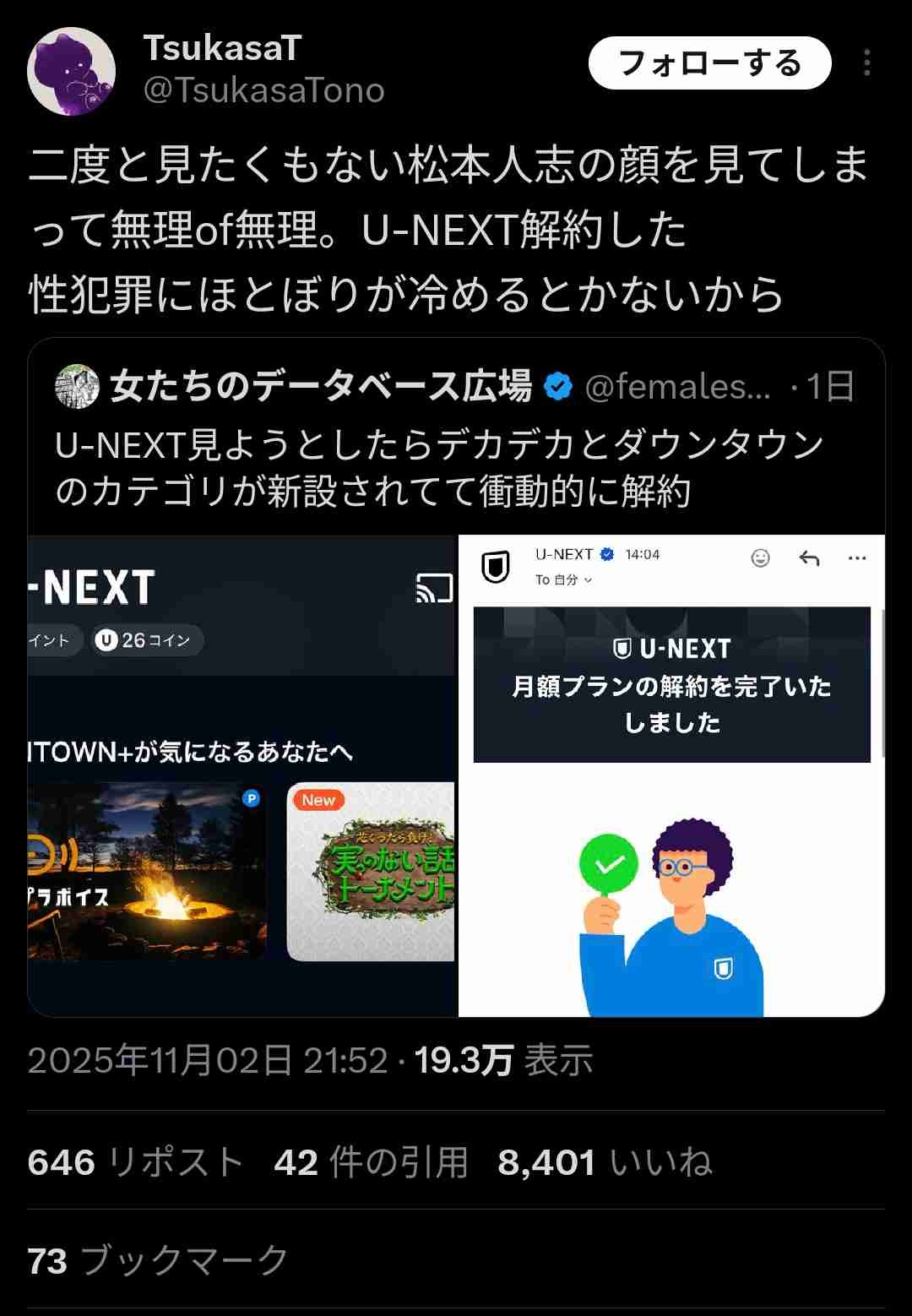 もし、マーケティングで表示をしている場合ですが、私自身は『東野登山隊』などが好きで、そうしたコンテンツがU-nextにあれば嬉しく思う面もあり、吉本興行全てを忌避してるわけではありませんが、流石に性暴力常習犯の松本氏の顔は強制的に表示して欲しくないので、この表示を消していただけるとありがたいですし、何かユーザー設定で非表示する方法があるとそれも教えてください。一方で、ケビィン・スペイシー氏なども性問題を起こしていますが、英国では無罪判決も出ており、役者としての作品参加と、本人の主催する番組も別だと思うので、U-nextで一概に「性問題を起こした人物は全部表示しないフィルター」などの実装は避けていただけると嬉しいです。
