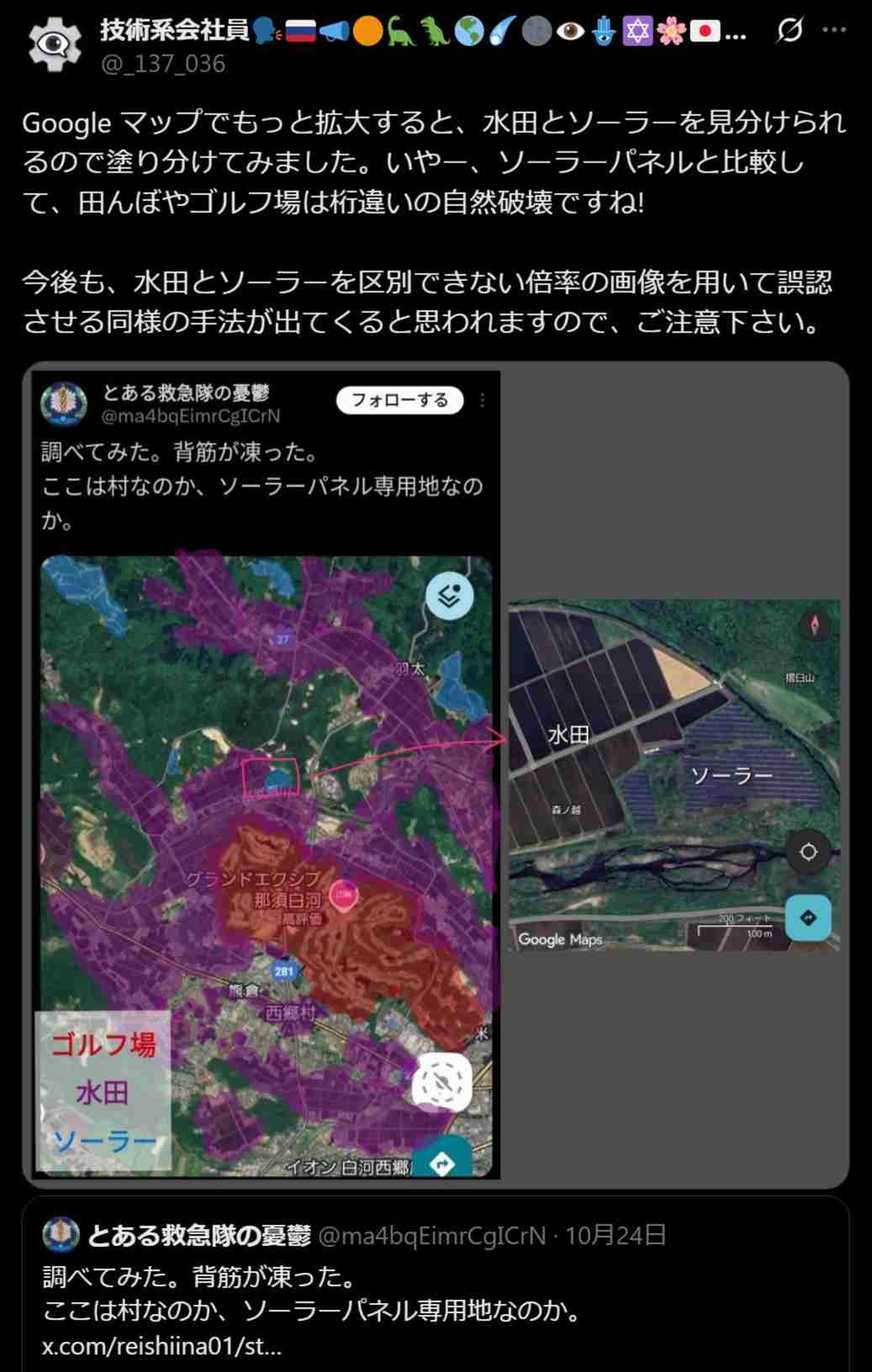 陰謀X民「なんてこった!これ全部ソーラーパネル専用地なのか」⇒田んぼとゴルフ場でした