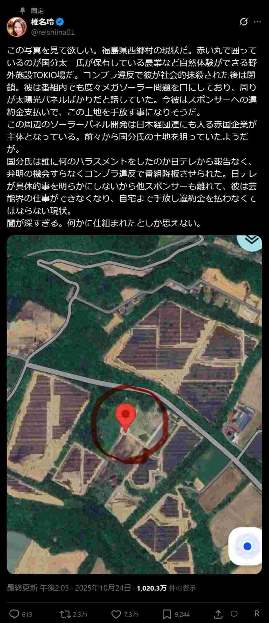 X民「国分太一はメガソーラー利権に狙われた。闇が深すぎる・・」⇒1000万ビュー 7.4万いいね