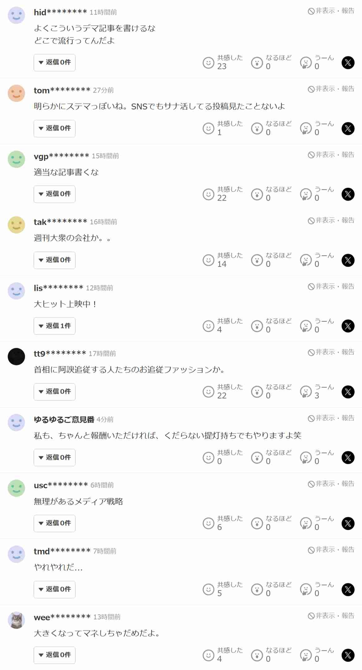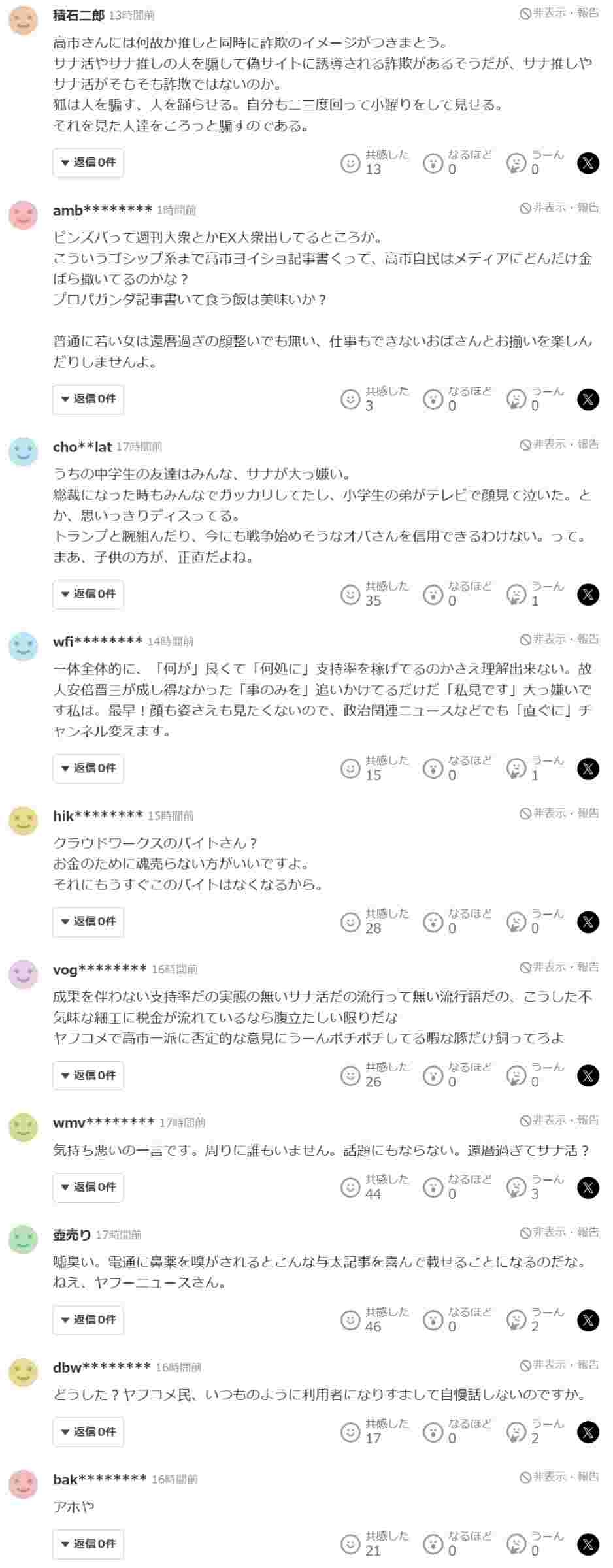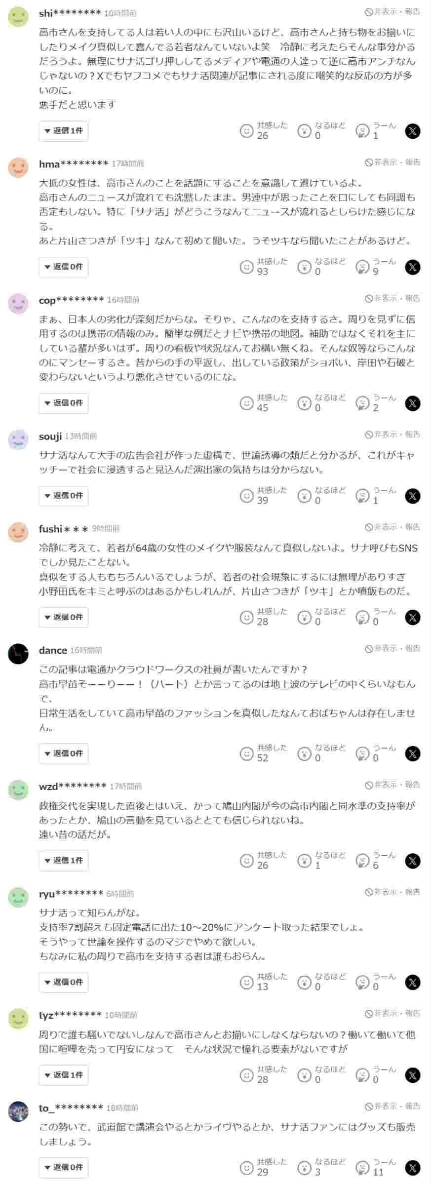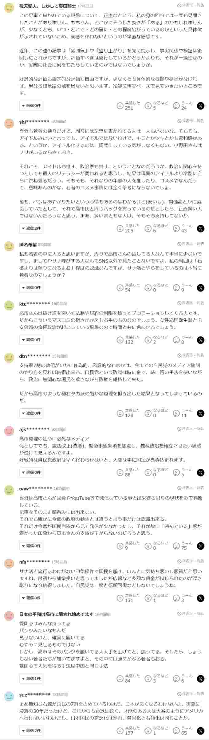 Yahooニュース「若者が高市・片山さつき・小野田をサナ・ツキ・キミと呼んでアイドル視しています」⇒コメ欄が批判で埋まる